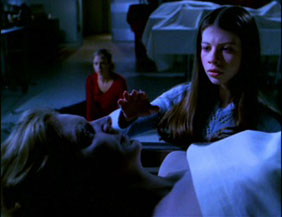 Anyway, I promised that I wasn't going to simply tote out high praise and palaver. What I intend to hone in on and discuss is more focused and detailed than a single season or even a single episode. The episode in question, "The Body," is, however, one of the great 45 minutes of serialized entertainment in the history of the televisual medium and a great starting point for those of you already self-identifying as "Buffy never gonna watch-ers" (bad pun intentional). No, there is an image, or more rather, an edit in this episode that, coupled with another image from the last shot of the same episode, may be one of the most replayed loops in my occasionally ADD head. Joss Whedon came up with something basic yet profound to say about death and memory and loss and grieving and a single shot has given me more to reflect on and feel attuned to than most anything else I have seen this decade, in any format. But first . . .